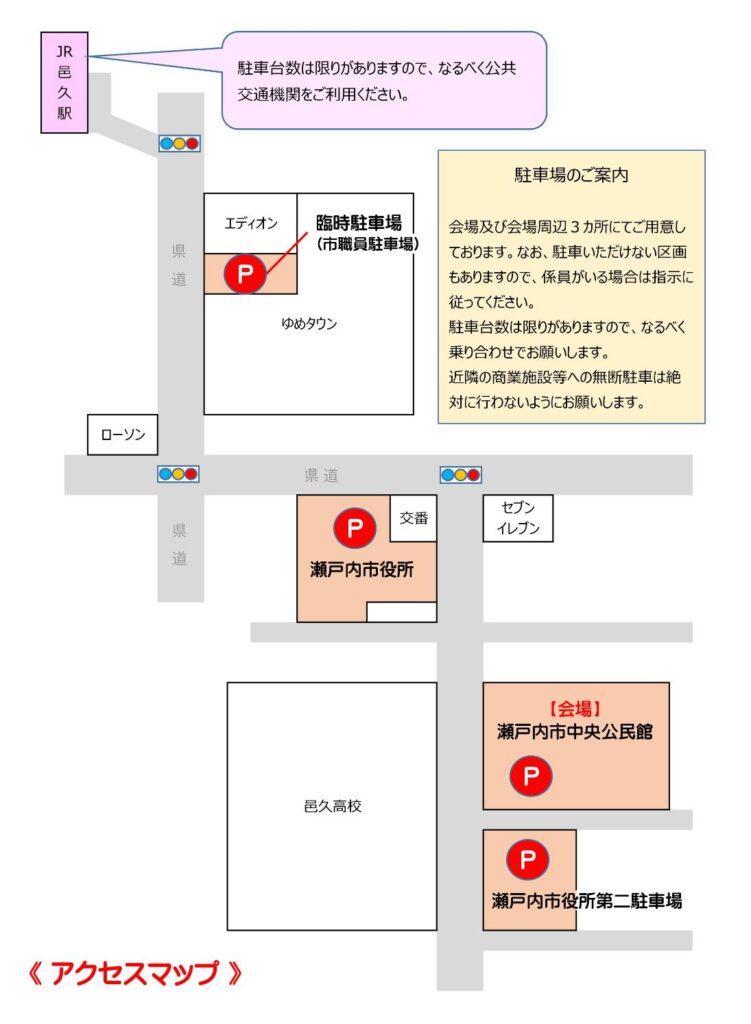 - 当日の駐車場は下図のとおりです。駐車できる台数が少ないので、なるべく公共交通機関のご利用か、乗り合わせにご協力ください。